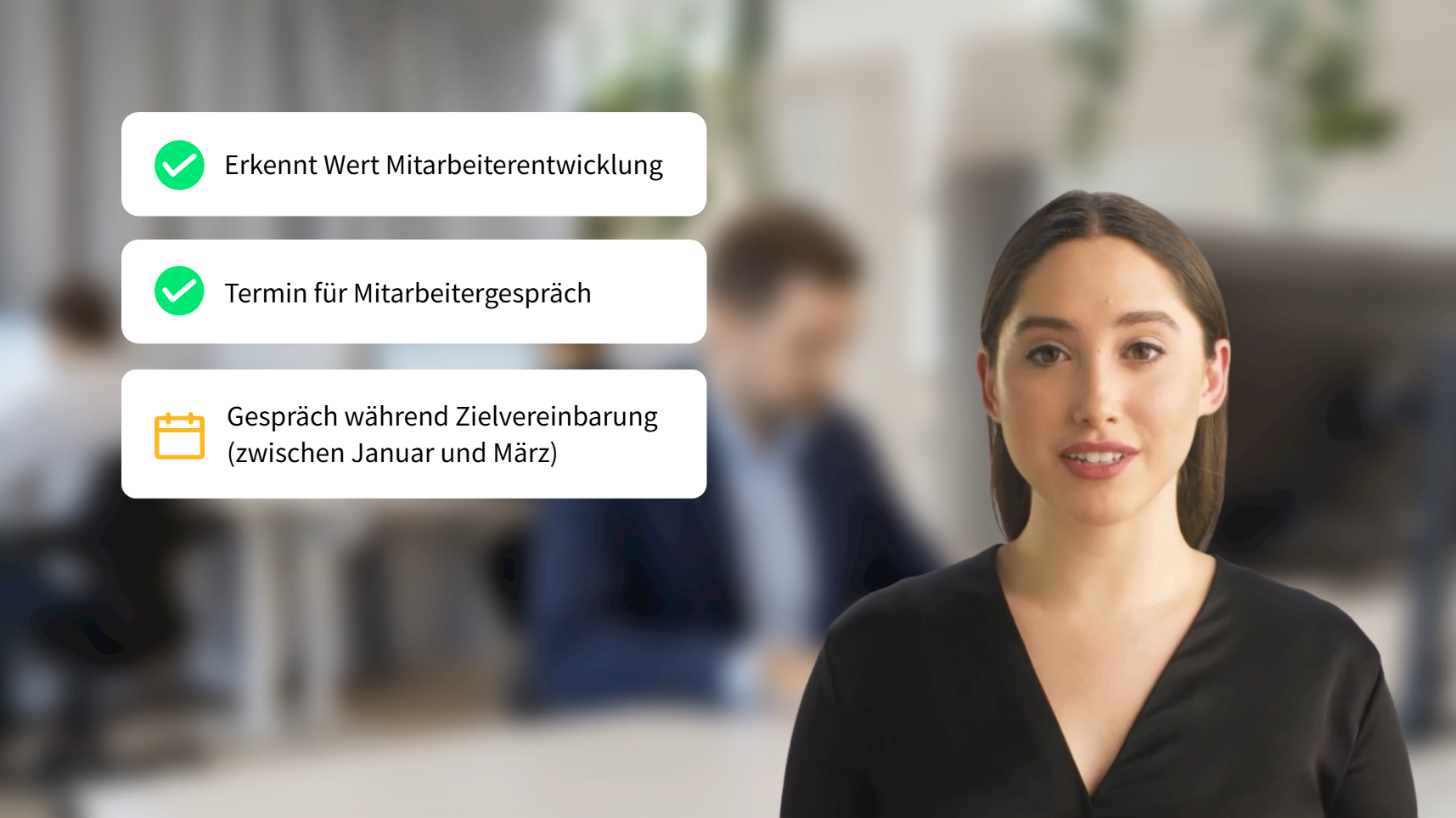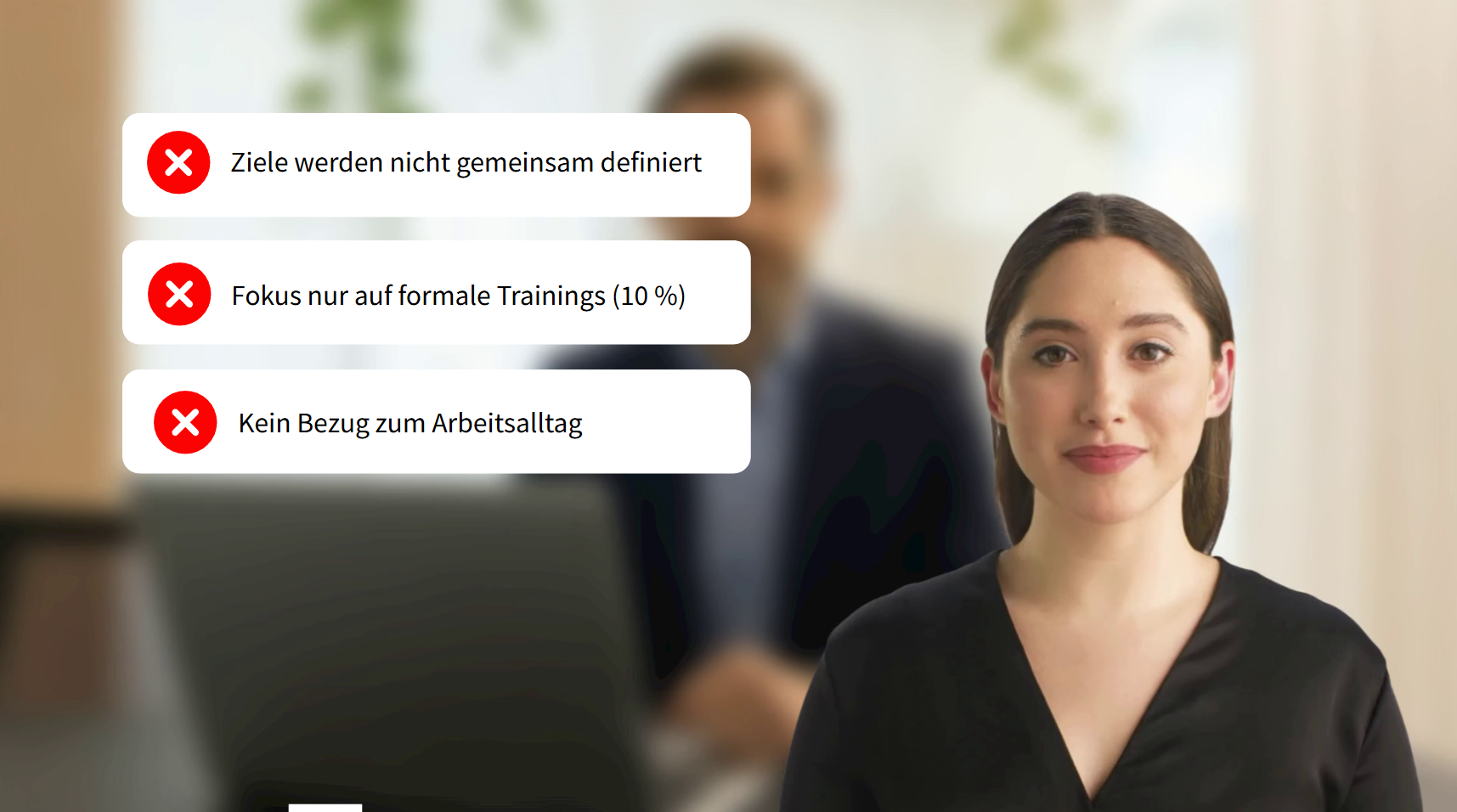 Unsere Lösung: Das Mitarbeitergespräch als interaktive Simulation. Die Lernenden erleben zunächst, wie ein Gespräch schiefläuft — falsche Gesprächsführung, unklare Ziele, fehlende Empathie. Anschliessend durchlaufen sie dasselbe Szenario richtig und lernen Schritt für Schritt, worauf es ankommt.